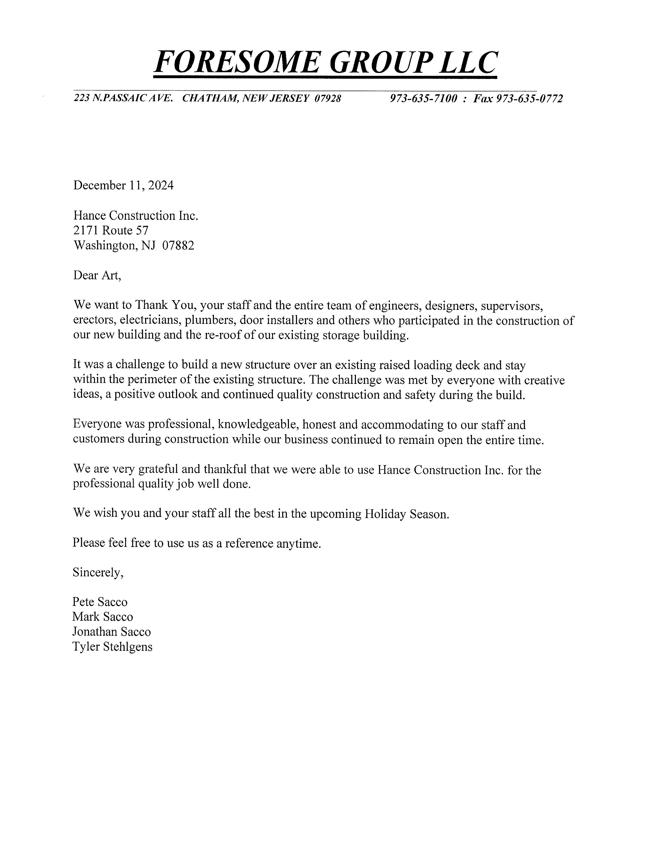 - Hance Construction did a great job for us at the Piscataway job. First class workmanship. You are a valued and trusted construction partner.